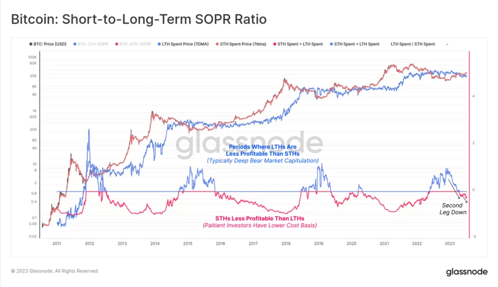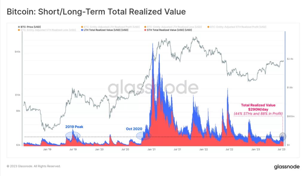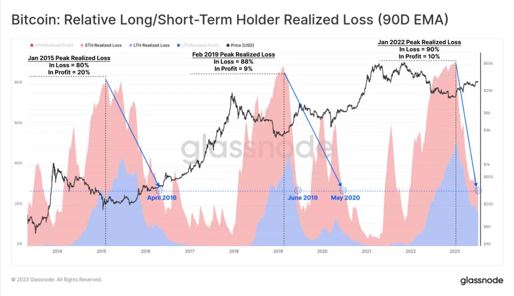 Źródło: GlassnodeGlassnode podzielił zrealizowaną wartość zablokowaną w BTC, aby zweryfikować siłę dotychczasowego odreagowania w 2023 roku. Zarówno grupy LTH, jak i STH widzą, iż zdecydowana większość z nich notuje zysk. Jest to olbrzymiwa poprawa w porównaniu z ekstremalnym dołkiem po implizji FTX. W tamtym czasie 90% wszystkich BTC odnotowywało straty (największa kapitulacja w całej historii według tej miary).