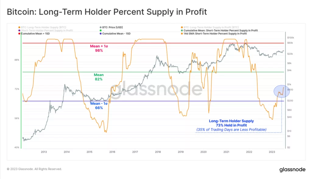 Źródło: GlassnodePorównując średni zysk krótkoterminowych inwestorów, z których wg. danych on-chain notuje ponad 85% posiadaczy, grupa długoterminowych hodlerów (LTH) jest stosunkowo mniej zyskowna. Glassnode wskazuje, iż kilka ponad 73% ich sald znajduje się w tej chwili w zysku. Oznacza to, iż około jedna czwarta całej podaży została nabyta po cenach wyższych niż 30 tys. USD, w ramach cyklu 2021 – 2022.