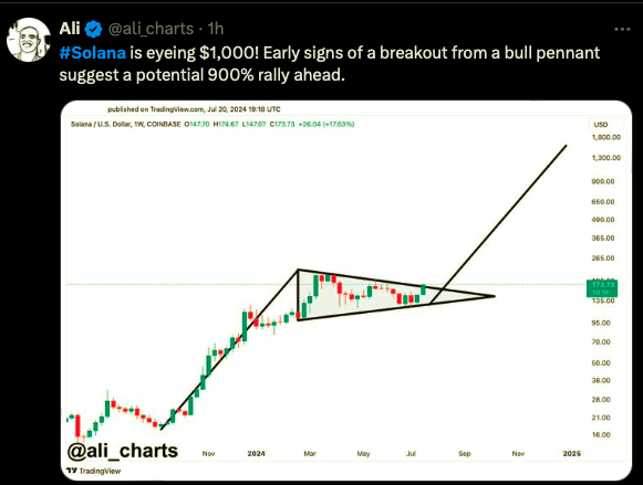 Solana, piąta co do wielkości kryptowaluta, wyceniana na 173 dolary z kapitalizacją rynkową wynoszącą 79 miliardów dolarów. W ostatnich dniach wykazuje silną odporność wzrostową, przekraczając swoją linię trendu spadkowego. najważniejszy poziom oporu na 175 dolarów jest w zasięgu ręki. Jego przekroczenie może napędzić SOL do wyższych poziomów, takich jak 188 i 205 dolarów. Ten potencjał wzrostu jest wspierany przez znaczący wzrost wolumenu obrotów i pozytywne wskaźniki techniczne.