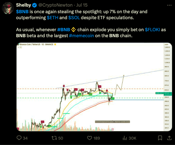 BNB, natywny token Binance, w tej chwili wyceniany na 597 dolarów z kapitalizacją rynkową wynoszącą 88 miliardów dolarów, wykazuje silny potencjał do osiągnięcia 100 miliardów dolarów kapitalizacji rynkowej do końca sierpnia. Wskaźniki techniczne wykazują wzorce wzrostowe, sugerując zwiększoną presję zakupową i pozytywne perspektywy. BNB niedawno przekroczył najważniejsze poziomy oporu, w tym 200-dniową średnią kroczącą (EMA), co wskazuje na dalszy wzrost ceny.