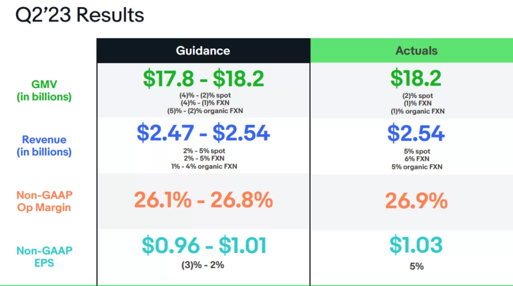 Źródło: eBay prezentacja wyników za II Q 2023Jak widać, wyniki były lepsze od samych prognoz spółki. Szczególnie dotyczy to oczyszczonej marży operacyjnej oraz oczyszczonego zysku netto na akcje. Warto zauważyć, iż eBay osiągnął take rate (tj. prowizję) na poziomie 13,9%. Jest to najwyższy poziom w ciągu ostatnich 6 kwartałów. eBay wygenerował także w II Q 2023 roku około 490 mln FCF. Jest to więc solidny zastrzyk gotówki, która może zostać przeznaczona na wypłatę dywidendy czy skup akcji.