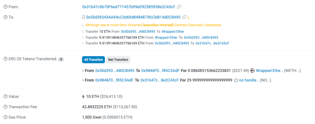 Zgodnie z danymi transakcyjnymi z eksploratora Etherscan i narzędzia do śledzenia portfeli Web 3.0. firmy DeBank, niedoszły inwestor poniósł opłatę za transakcję (tzw. gas fees) w wysokości 42,8 ETH, co w momencie transakcji odpowiadało równowartości 113 211 dolarów. Tak wysoka opłata była częścią agresywnej strategii mającej na celu wyprzedzenie innych inwestorów w walce o tokeny NO, a niestety blockchain Ethereum nie jest z gumy. Im więcej zapłacisz, tym większa szansa, iż wysuniesz się na czoło kolejki osób oczekujących na realizację transakcji.
