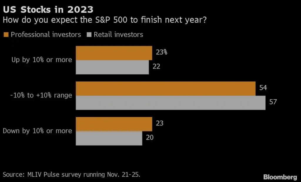Według analityków Swissquote, pierwsza połowa 2023 roku będzie zdominowana przez wyższe stopy procentowe Fed. Te wg. Deutsche Banku mogą rosnąć choćby do lipca 2023 (!). Następne kwartały zdaniem Swissquote nie przyniosą ulgi, w okolicach trzeciego i czwartego kwartału przyszłego narracja rynkowa przesunie się w kierunku 'niskiego wzrostu i recesji’. Wracając do MLIV połowa respondentów oczekuje, iż S&P 500 zakończy rok 2023 w przedziale 10% niższym (lub wyższym) zatem wszyscy oczekują wyższej zmienności. Jest to zgodne z oczekiwaniami Wall Street, przy czym strategowie Goldman Sachs Group Inc, Morgan Stanley i Bank of America Corp widzą S&P 500 stosunkowo płasko na koniec roku. Wszyscy oni oczekują, iż pogarszające się zyski firm obciążą wyniki akcji. Analitycy będą musieli obniżyć swoje szacunki dotyczące zysków wg. Anneki Treon, dyrektor zarządzającej w Van Lanschot Kempen z siedzibą w Amsterdamie. Fundusz spodziewa się, żeStany Zjednoczone w 2023 odnotują zaledwie umiarkowany wzrost, a Chiny nie osiągną spodziewanego boomu wobec topniejącego popytu na import towarów z Państwa Środka (zapaść e-commerce). Mimo całego pesymizmu, respondenci ankiety powiedzieli, iż jest bardziej prawdopodobne, iż inflacja w USA spadnie poniżej 3% w 2023 r. niż przekroczy 10%, co daje okno na pewną ulgę pod koniec roku. Ale bardziej dla kredytorbiorców niż właścicieli aktywów, których portfele mogą zostać nadszarpniętem zapaścią w przychodach spółek. U większości uczestników ankiety dominowała też awersja do ryzyka przez możliwość eskalacji konfliktów geopolitycznych w przyszłym roku, na przykład Chiny, Tajwan i USA oraz NATO z Rosją.