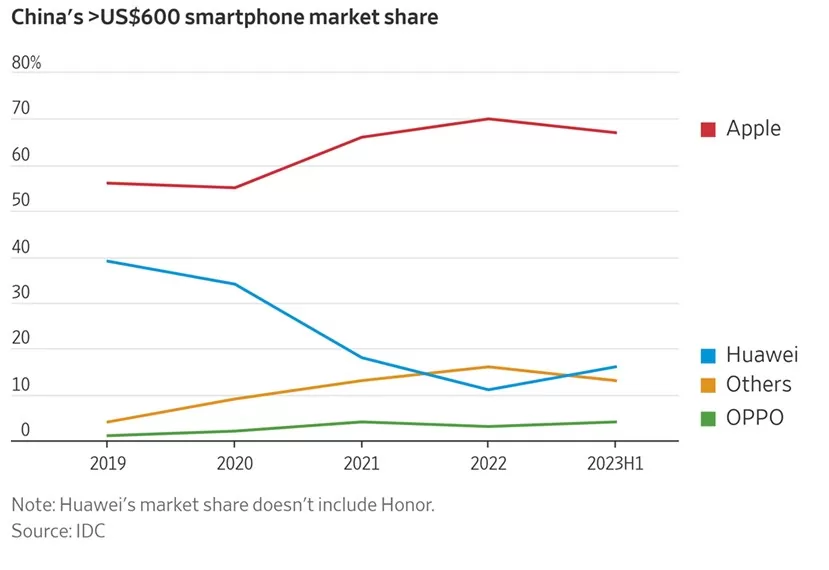 Udział Apple w chińskim rynku (który stanowi ok. 18% sprzedaży Apple) spada od 2022 roku – zyskują Huawei i OPPO. Źródło: IDCEra iPhone przeminie niczym płyty CD?