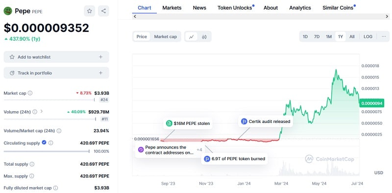 Fot. materiały partneraSpadek wartości Pepe wynikać może z debiutu nowego projektu – Pepe Unchained ($PEPU). To token wciąż dostępny w fazie przedsprzedaży, przekonujący inwestorów własnym blockchainem warstwy 2. Dla inwestorów oznacza to dużo szybsze oraz tańsze transakcje w porównaniu z ekosystemem Ethereum. Dlatego zakup $PEPU w fazie przedsprzedaży może być rozsądnym wyborem. Natomiast należy pamiętać, iż to Pepe jest aktualnie w TOP 3 tokenów memowych. Dlatego to moneta o bardziej ugruntowanej pozycji i łącznej kapitalizacji blisko 4 mld USD.