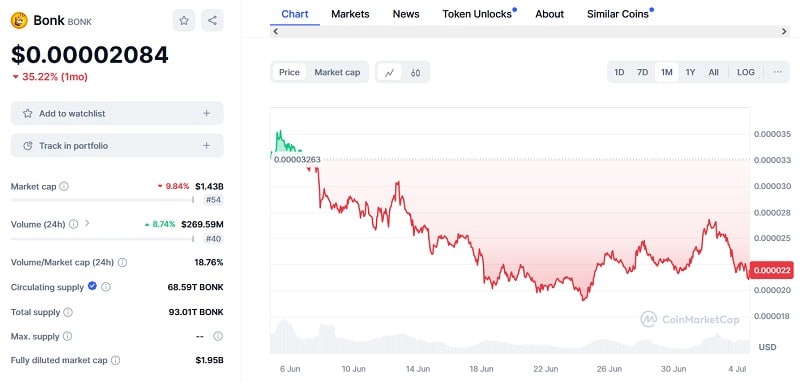 Dlatego nie jest żadnym zaskoczeniem, iż również token Bonk stracił ostatnio sporo na wartości, ponieważ ponad 10% w tydzień i aż przeszło 35% w miesiąc. Podobnie jak w przypadku Pepe, można potraktować to jako korektę. Wydaje się, iż $BONK powinien odrobić stratę, kiedy inwestorzy ponownie przychylnym okiem spojrzą w kierunku kryptowalut. Pod koniec maja token kosztował 0,00004115 USD, a więc dwukrotnie więcej niż aktualnie. Powrót do tej wartości jest jak najbardziej możliwy.