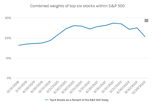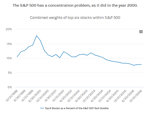Największe 6 spółek z S&P 500 miało problemy w 2000 roku i traciło wagę w indeksie. Źródło: Morgan Stanley, Fact Set