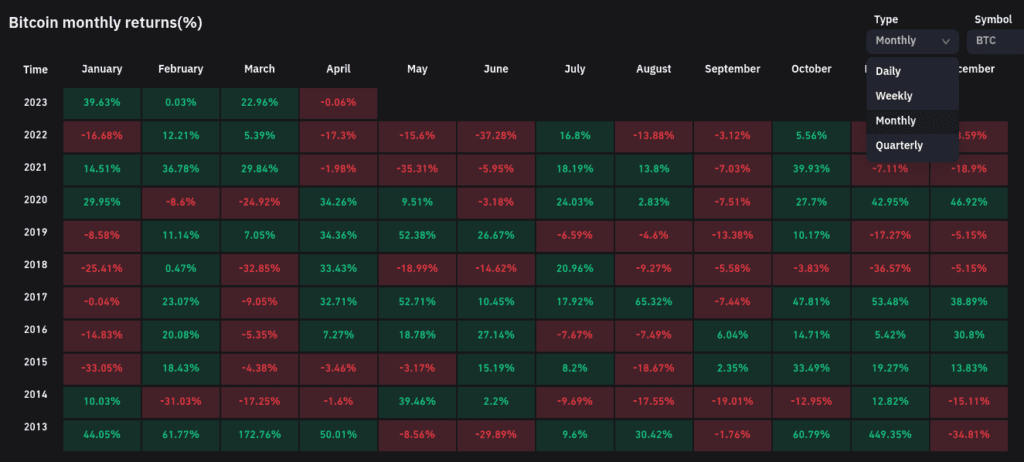 Według danych Coinglass, 23% wzrost pary BTC/USD prawie odpowiada jego wynikom z 2021 roku, przy czym rok 2013 pozostaje bardziej niestabilny.