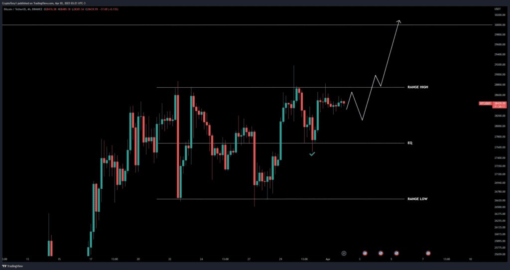 „Wydaje się, iż zakres w ten weekend jest kukurydziany, a dla kontynuacji byki chcą odzyskać najwyższy zakres na poziomie 28 750 $. Dopóki się nie zrelaksujemy” – napisał Crypto Tony na Twitterze tego dnia.