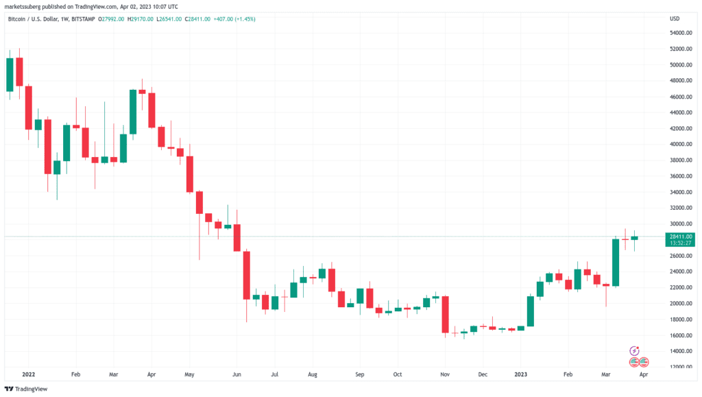 Dane z Cointelegraph Markets Pro i TradingView pokazały, iż kurs BTC/USD był stabilny w weekend po zamknięciu marca na poziomie blisko 28 500 USD.