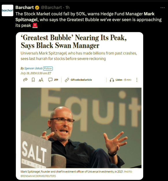 Spitznagel porównał obecną bańkę rynkową do bańki internetowej z lat 90. Jednocześnie zasugerował jednak, iż obecna może być jeszcze skrajniej napompowana ze względu na nadmierną interwencję rządu.