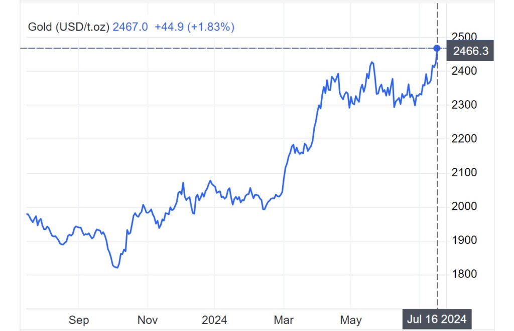 Ceny złota doznały raptownego skoku od początku bieżącego tygodnia. Ich poziom zbliżył się do rekordowego, osiągając wartości powyżej 2460 dolarów za uncję.