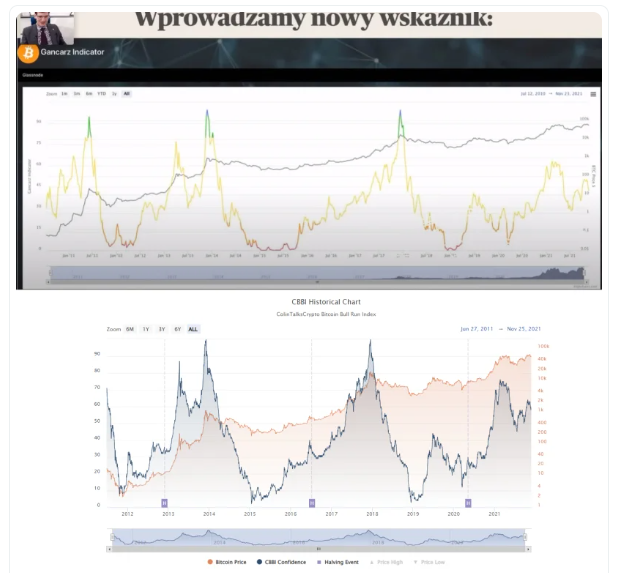 Źródło: Instytut KryptografiiZ Gancarzem zbudujesz 'żelazny kapitał’ rozmnożysz 31 000 zł do przeszło 2 milionów! Gancarz pokaże Ci 'krok po kroku by mieć szansę dojść’ (pozostawiamy dowolną interpretację). To jeszcze nic. Słynny analityk Glassnode’a zaprezentuje Ci swój modelowy portfel inwestycyjny. Aż kusi by sprawdzić, co w nim siedzi. W dodatku modelowy portfel inwestycyjny? Co znaczy modelowy? Podłączysz się pod fundusz Gancarza czy może zobaczysz jego wróżby z kresek i kolorowych świeczek? Oto słynny, rzekomo złożony i precyzyjny Gancarz Indicator. Poniżej CBBI Index – widzicie podobieństwo? Gancarz zaprezentował wskaźnik, skopiowany z CBBI Index…? To tak można? Może należy mu się statuetka Head of Research w Instytucie Kryptografii.