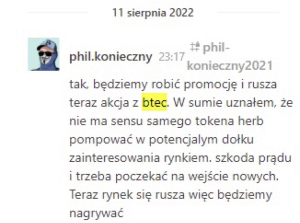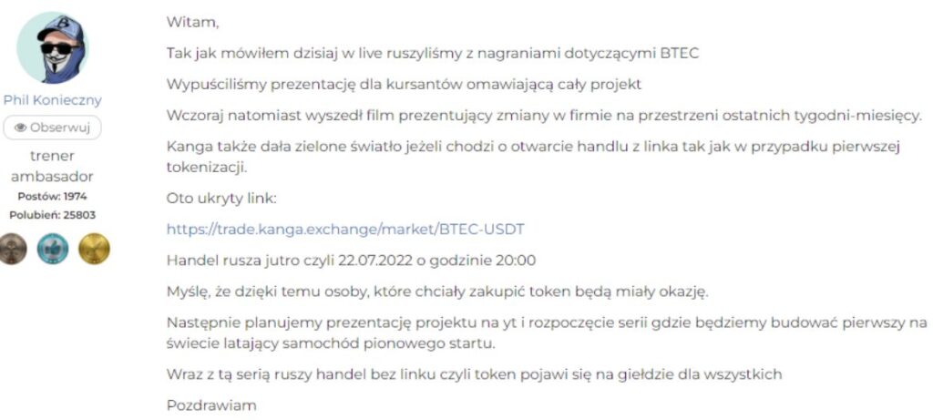 - Czy Phil Konieczny jest także zaangażowany w 'pompowanie’ tokenów, by zostawić inwestorów z jak najgorętszym towarem w rękach? Linki dostępne tylko na ukrytym forum, a kursanci? W następnej kolejności. Oraz marketingowa machina sugerująca kolejną budowę piramidki finansowej z obietnicą latającego samochodu w tle? Instytut próbuje uczyć się od Roba Gryna?