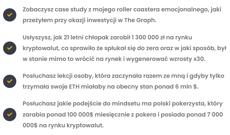 Emocjonalny rollercoaster- może Jarzombek ma ukryte skłonności do hazardu? 21 letni chłopak zarobił 1,3 mln zł na crypto ale spłukał się do zera, wrócił i pomnożył kapitał x30 (nie jest jasne jaki był to kapitał ani o kim mowa). Lekcja od osoby, która zaczynała z Jarzombkiem ale nie trzymałą swoich ETH, które byłyby warte 6 mln USD (ale nie są). Rzeczywiście żenujący element, zaproszenie kolegi – takie przypadku mnożyć może niemal kazdy, kto siedzi w crypto. Jest też trochę historii o pokerze. To wszystko w promocyjnej cenie 3470 PLN. Po prostu niesamowite jakie kwoty ludzie płacą za kursy traderów-amatorów.