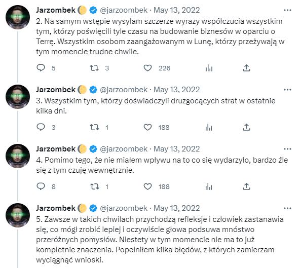 - Rzekomo został z 13% pozycji w Lunie i poniósł milionowe straty na implozji ekosystemu (czy ktoś wie, gdzie można to sprawdzić?)
