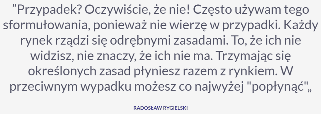 Oto Radek Rygielski legitymujący się kilka lat temu jako trader zarabiający trzy średnie krajowe (zaczynał od ostrożnych cyfr, jak na przyszłego szkoleniowca). Co znajdziemy w wywiadzie? Między innymi pytania zawierające już gotową odpowiedź! ’Radku, gdzie szukać ekspertów?’, 'Gdzie szukać, darmowej jakościowej wiedzy?’.Oczywiście po to by za chwilę płynnie przejść do samego fenomenu Rygielskiego, tradera o którym powinno się mówić na całym Wall Street! To wywiad, czy płatne lokowanie produktu?