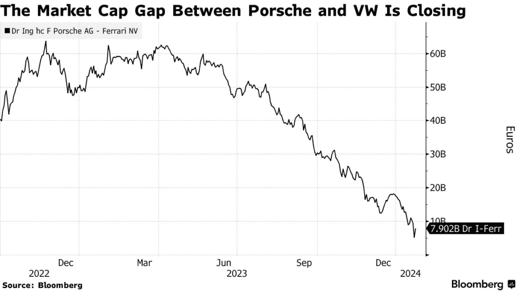 Marka zbliża się już kapitalizacją do Volskwagena. Po giełdowym debiucie, wspomniana luka między dwoma niegdyś połączonymi markami, wynosiła 40 miliardów euro, na korzyść Porsche. Wskaźnik wycen cena/zysk dla Porsche spadł do poziomu poniżej jednej czwartej Ferrari. Niemcy zmagają się z istotnymi przeszkodami produkcyjnymi. Te wpłynęły na ekspansję kluczowych dla marki modeli. W tym na rekordowo sprzedającego się SUV-a Macan.