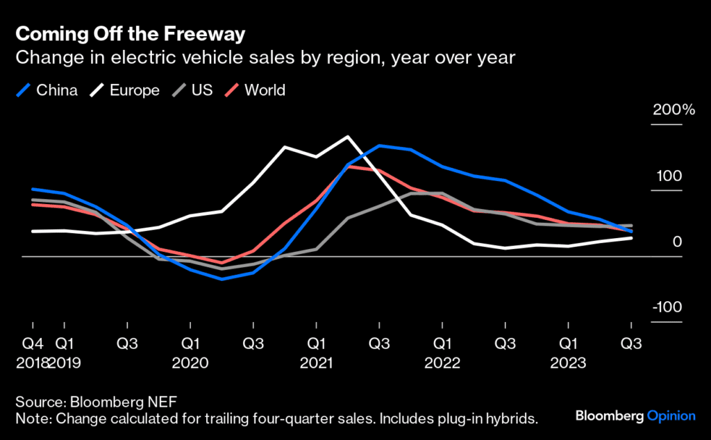 Wzrost sprzedaży r/r elektryków (w tym hybryd) na świecie zauważalnie spowalnia od 2021 roku. W 2023 roku rósł adekwatnie już tylko w Europie. Źródło: Bloomberg’Lepiej nie będzie’