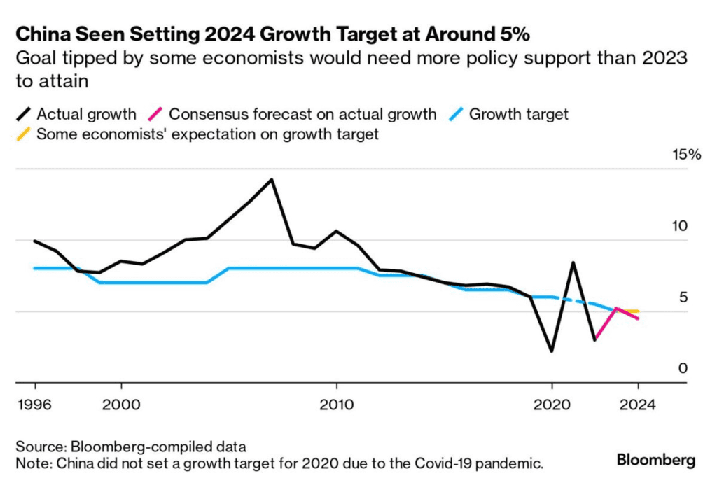 W 2024 roku Chiny chcą powtórzyć 5% wzrost, który wg. oficjalnych danych osiągnęły w 2023 roku. Niektórzy analitycy uważają jednak, iż chińska gospodarka w 2023 wzrosła o zaledwie 1,5% (mimo lockdownów w 2022 roku), a oficjalne urzędy zaniżają dane. Źródło: Bloomberg