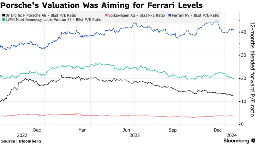 Według analiz Bloomberg Intelligence, głównym powodem rozczarowania inwestorów jest to, jak kilka opcji ekspansji ma Porsche. Firma chce poradzić sobie ze spowolnieniem w Chinach ale istnieje duże ryzyko, związane z wprowadzaniem i rentownością nowych modeli. W przeciwieństwie do Ferrari, którego deficytowy model biznesowy zapewnia wyprzedany portfel zamówień na kilka lat, Porsche jest bardziej zależne od sił makro. Udział przychodów z Chin spadł do 26% w pierwszej połowie 2023 r., z prawie 33% w 2022 roku.