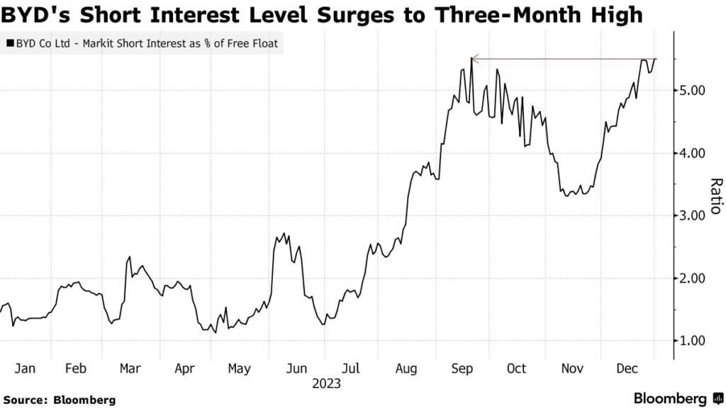 Mimo zwiększania udziałów w rynku chiński BYD walczy z problemami, przede wszystkim z lokalną konkurencją. Ilośc akcji sprzedanych krótko (spekulanci, stawiający na spadek cen akcji) wzrosła do blisko 5%. Źródło: Bloomberg