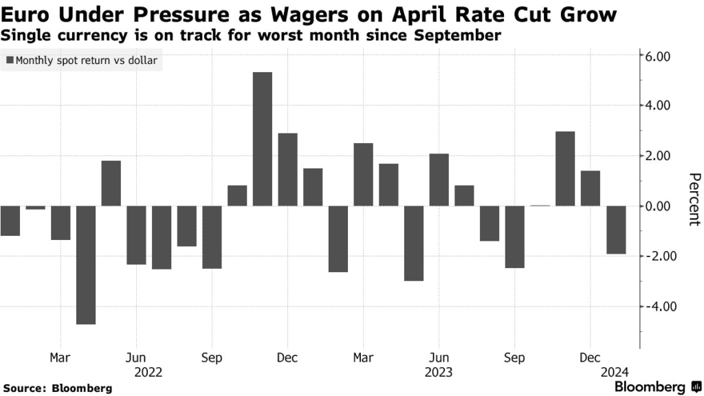 Rynek wycenia wyższe szanse na obniżkę stóp strefy euro w 2024 roku ale samo euro wykazuje się największą słabością od października 2023 roku. Nie wróży to nic dobrego dla gospodarki Starego Kontynentu. Z drugiej strony rynek widzi spory wzrost realnych wynagrodzeń, w miarę spadku inflacji, co w połączeniu z potencjalnie tańszym kredytem może wspierać popyt na motoryzacje. Źródło: BloombergSpokojnie, Porsche nie upadnie
