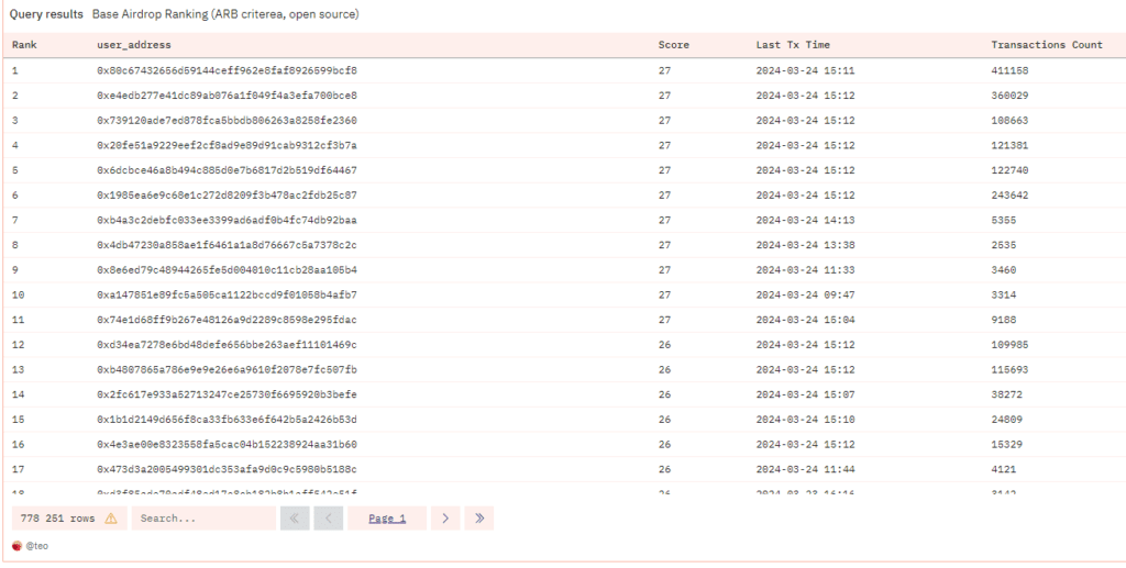 Jeden z użytkowników platformy analitycznej Dune Analytics przygotował choćby dashboard symulujący jak wyglądałby przydział i statystyki farmienia airdropu BASE przyjmując za wzór kryteria zastosowane w zrzucie konkurencyjnego łańcucha Arbitrum (ARB). Zobaczcie sami.