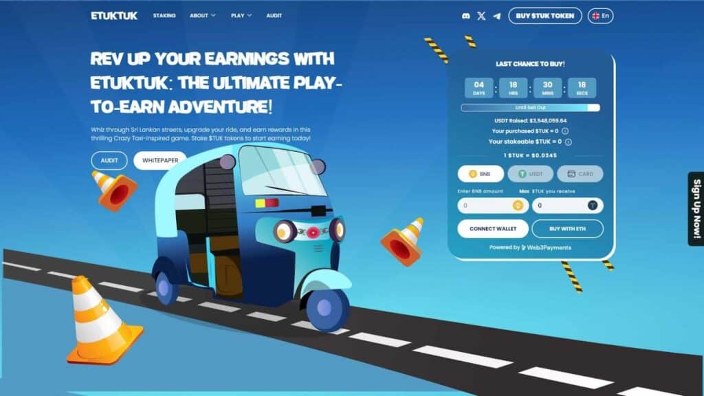 Kryptowaluta ta działa na Binance Smart Chain (BSC) i ma najważniejsze znaczenie dla transakcji w ekosystemie eTukTuk. w tej chwili projekt znajduje się w fazie przedsprzedaży i do tej pory zebrał ponad 3,5 miliona dolarów. Ten etap umożliwia wczesnym inwestorom zakup eTukTuk po potencjalnie niższej cenie niż po debiucie na giełdzie.