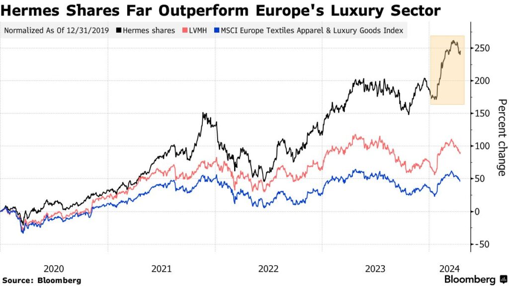 Akcje Hermes radzą sobie w tym roku lepiej na tle konkurencji i dużo lepiej od LVMH. Spółka operuje wbranży produktów adresowanych dla najbogatszch klientów. Źródlo: BloombergWojna klanów?