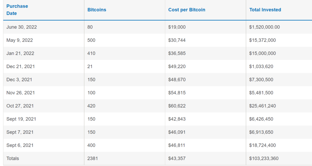 — H.E. Justin Sun (@justinsuntron) November 17, 2022Przypomnijmy, iż El Salvador jest w tej chwili w posiadaniu 2381 Bitcoinów (BTC), w które zainwestował środki o łącznej wartości 103 mln dolarów. Wartość Bitcoinowej inwestycji Bukele spadła do 39,4 mln dolarów. Poniższa tabela dokładnie pokazuje historię zakupów Bitcoina (BTC) El Salvador.