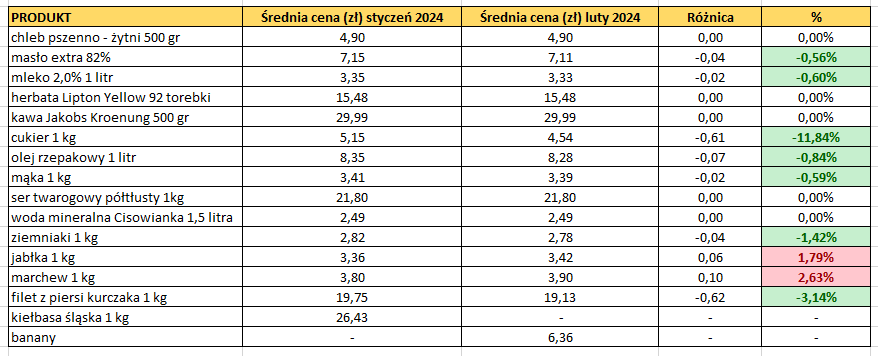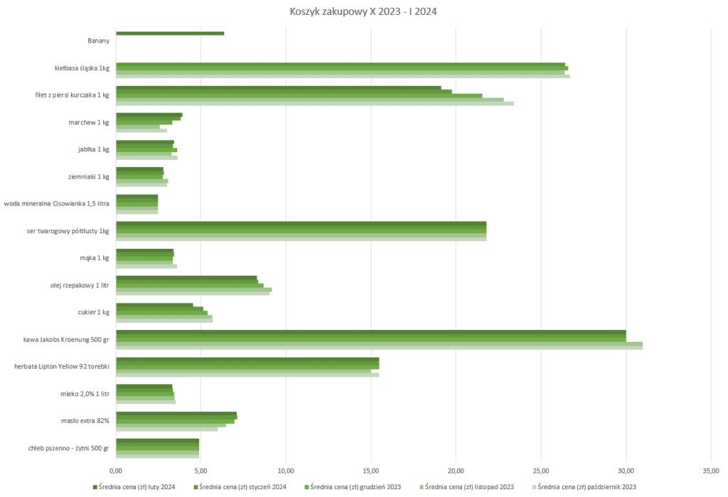 Nasz koszyk obejmuje dane z przełomu od października 2023 r. do stycznia 2024 r. i zawiera głównie ceny żywności, jako iż są one bardzo istotne z punktu widzenia najuboższych Polaków. Skupiliśmy się jednak przede wszystkim na zmianie miesiąc do miesiąca (m/m),