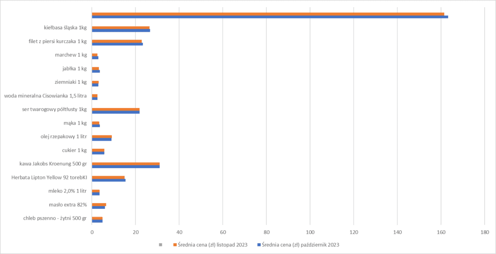 Nasz koszyk obejmuje dane z przełomu listopada i października i zawierać będzie głównie ceny żywności, jako iż są one bardzo istotne z punktu widzenia najuboższych Polaków. Znajduje się w nim 15 podstawowych produktów, których zmiany cen zaprezentujemy co miesiąc.