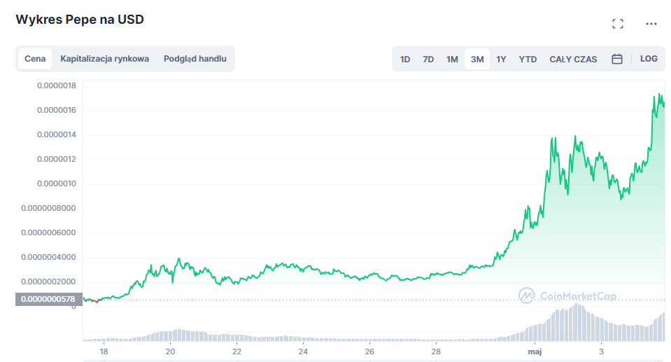 Kryptowaluta PEPE, wzorowana na popularnej, internetowej żabce o tym samym imieniu, zdobyła szturmem świat mem-coinów, aspirując najwyraźniej do dołączenia do grona swoich poprzedników SHIB i DOGE. Kolejne korekty są konsekwentnie zjadane, a typowanie maksimów staje się trudne. Od momentu opublikowania ostatniego wątku do projektu wlało się kolejne 200 mln USD. Co gorsza (zależy dla kogo, oczywiście) PEPE rozpoczął także mem-coin season, a krypto anonki stale wyszukują kolejnych piramid finansowych, byle by tylko być tym, który zrzuci swoje tokeny na górce wcześniej niż inni.