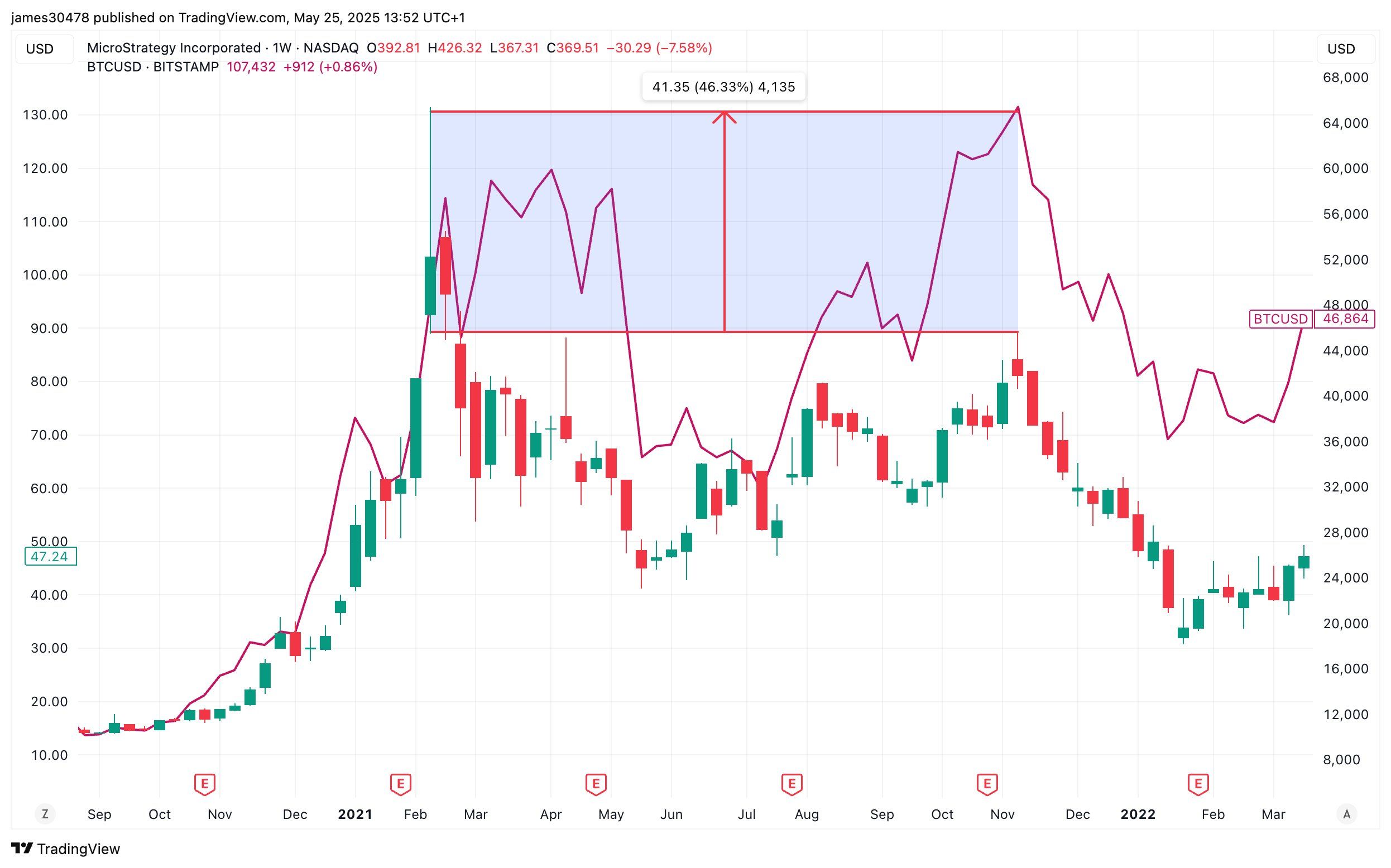 Cena Bitcoina i cena akcji MicroStrategy (MSTR) 2021 – 2022. Źródło: James Van StratenWykres pokazuje, iż w listopadzie 2021 roku MSTR spadł o około 50% od swojego poprzedniego szczytu. Natomiast Bitcoin wtedy osiągnął nowy rekordowy poziom 69 000 USD. Podobny scenariusz rozwija się teraz. MSTR zakończył 50% spadek od swojego szczytu z końca 2024 roku, a Bitcoin przez cały czas osiąga nowe szczyty powyżej 111 000 USD.