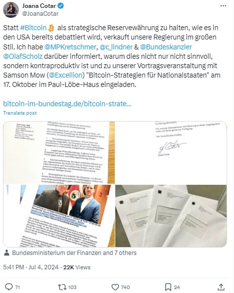 Joana Cotar, posłanka do Bundestagu, zwróciła się do czołowych niemieckich polityków, by zaprzestali sprzedawanie Bitcoina. Posłanka w piśmie skierowanym do Michaela Kretschmera, jednego z wiceprzewodniczących CDU, Christiana Lindnera, federalnego ministra finansów, a także kanclerza Olafa Scholza, argumentuje, iż przynosi to efekt przeciwny do zamierzonego.