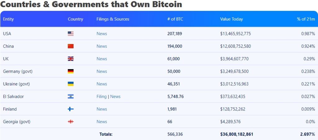 Źródło: https://bitcointreasuries.com/Według Bitcoin Treasuries Stany Zjednoczone stały się największym właścicielem BTC dzięki licznym konfiskatom aktywów kryptograficznych. Aktualnie USA posiada 213 246 BTC o wartości prawie 14 miliardów dolarów. Na drugim miejscu znajdują się Chiny, które posiadają 190 000 Bitcoinów o wartości 12,3 miliarda dolarów. Wielka Brytania zamyka pierwszą trójkę z 61 000 BTC szacowanymi na 3 miliardy dolarów.