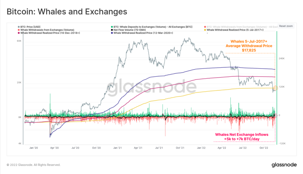 Powyższy wykres wskazuje relacje wielorybów (podmiotów posiadajcych więcej niż 1000 BTC) oraz giełd. Żółta linia pokazuje średnią cenę sprzedaży BTC przez wyeloryby od 5 lipca 2017 roku (start Binance), która notowana jest na poziomie 17,825 USD. Przy cenach spot znajdujących się w tej chwili na poziomie 16 000 USD obecnie, pierwszy raz od marca 2020 roku gdy grupa wielorybów jest na niezrealizowanej stracie. Wieloryby rzeczywiście deponowały BTC na giełdy, z nadwyżką między 5k a 7k BTC dziennie w napływach netto w ciągu ostatniego tygodnia, co rodzi obawy o możliwą kapituację części największych inwestorów. Źródło: Glassnode