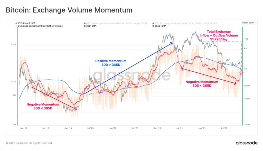 Patrząc na 30-dniową średnią ruchomą, łączny wolumen napływu i odpływu denominowany w USD na wszystkich giełdach gwałtownie wzrósł, osiągając w tym tygodniu 1,72 mld USD dziennie. Powyższy wykres przedstawia miesięczną średnią (kolor czerwony) w stosunku do średniej rocznej (kolor niebieski) jako wskaźnik ogólnego momentum sieci Bitcoin. Historycznie, okresy, w których miesięczna średnia wolumenów wymiany przekracza roczną, sygnalizowały pozytywne momentum rynkowe, ponieważ więcej wolumenu monet zmienia ręce. Na obecnym rynku, łączny napływ i odpływ wymiany musiałby osiągnąć i utrzymać poziom powyżej 2,15 mld USD, by zasygnalizować pozytywne momentum na tym froncie. Źródło: Glassnode