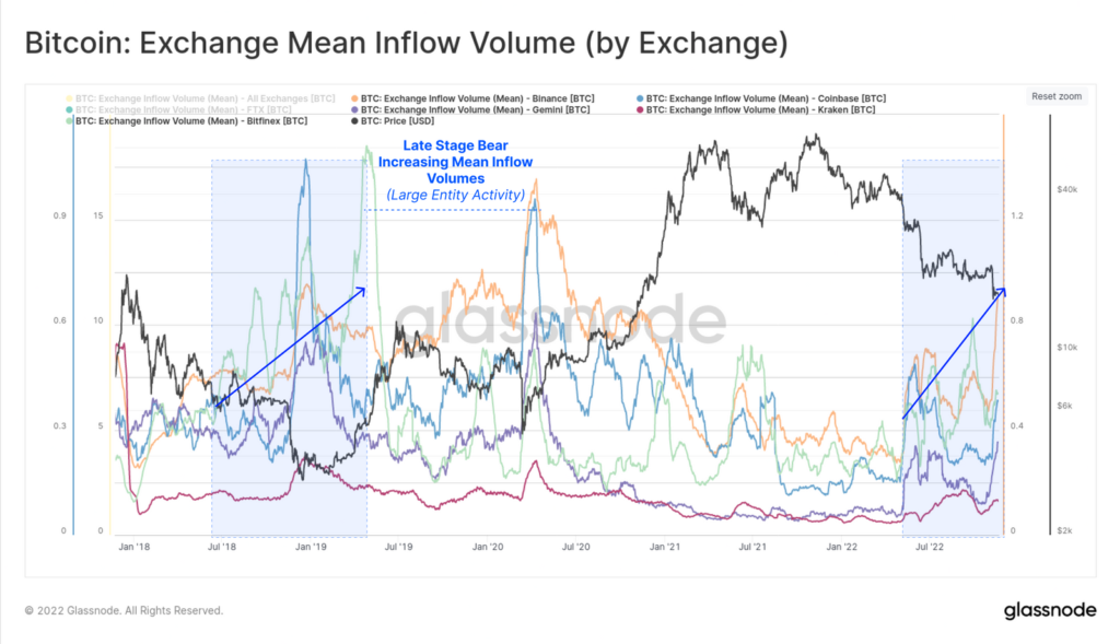 Trendem, który można obserwować na przykładzie późnej fazy kryptowalutowej bessy z 2018-19, jest zagregowany wzrost średniego wolumenu napływającego na giełdy. Innymi słowy, średnia wielkość depozytu na wszystkich głównych giełdach wzrasta w ujęciu USD, ponieważ rynek uformował dno cyklu. Jest to obecne na wszystkich głównych giełdach, w tym Binance, Bitfinex, Coinbase, Gemini i Kraken. Podobny trend obserwujemy nieustannie od końca maja po implozji projektu LUNA-UST. Wskazuje to, iż ogólnie w ciągu ostatnich 6 miesięcy nastąpił wzrost netto depozytów o większych rozmiarach. Potwierdza to, iż podmioty takie jak wieloryby, fundusze i instytucje miały większą dominację w całkowitych depozytach giełdowych. Wydaje sie to też oczywiste patrząc na inflację i ograniczone wydatki klientów detalicznych z których większość notuje straty i zakupiła BTC na znacznie wyższych poziomach, nie uśredniając ceny zakupu. Źródło: Glassnode