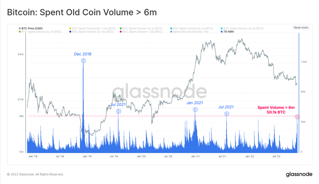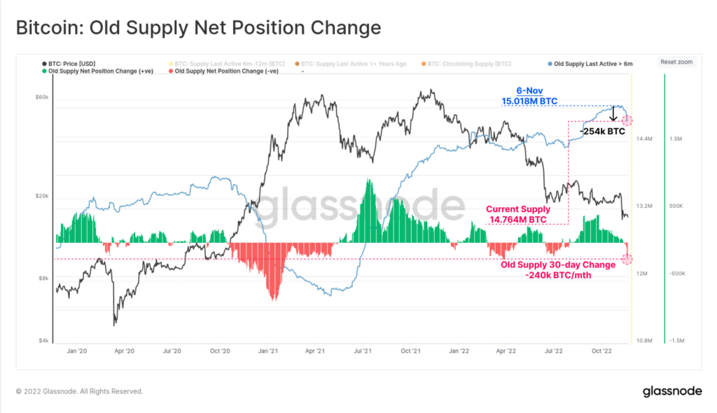 Wolumen wydanych BTC starszych niż pół roku wykazał piątą, najwyższą wartość w ciągu ostatnich prawie pięciu lat. W dniu17 listopada wydano ponad 130,6 tys. BTC w wieku 6 miesięcy lub więcej, a średnia z 7 dni wynosi w tej chwili 50,1 tys. BTC dziennie. Sugeruje to, iż na rynku istnieje wystarczająco duża niepewność, która skłania wieloryby i długoterminowych inwestorów do potencjalnie zmiany strategii i sprzedaży rezerw. Pamiętajmy jednak, iż sprzedawane przez inwestorów rezerwy BTC musiał ktoś nabyć, tokeny zmieniają właścicieli. Źródło: Glassnode