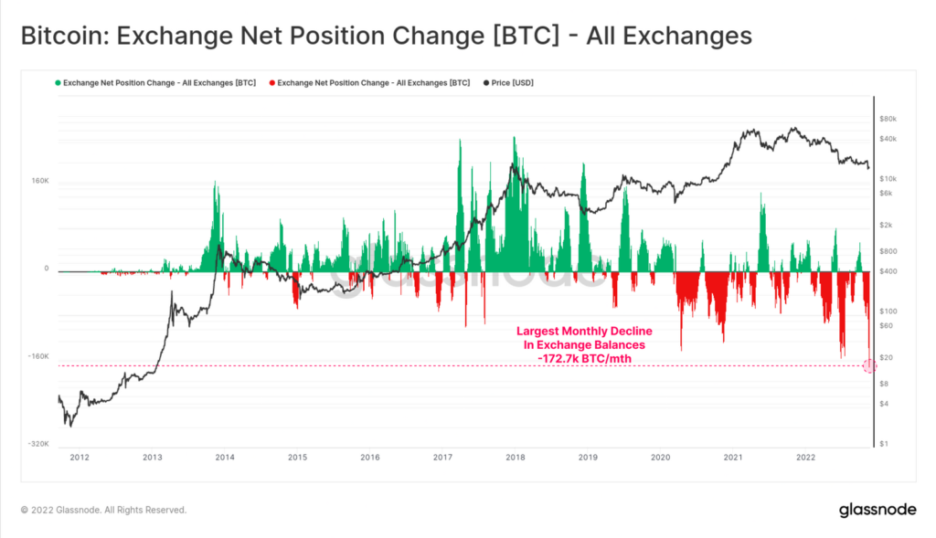 Odpływy z giełd do prywatnych portfeli inwestorów niemal wszystkich rozmiarów osiągnęły historyczną skalę, ponieważ posiadacze Bitcoinów szukają bezpieczeństwa, a ich zachowanie do powierników spadło. W rezultacie tej sytuacji, 30-dniowa zmiana pozycji netto wszystkich sald giełdowych osiągnęła w tym tygodniu nowy rekord wszechczasów w zakresie odpływów.BTC odpływa w tej chwili z giełd w tempie -172,7 tys. BTC miesięcznie, przyćmiewając poprzedni szczyt ustanowiony po wyprzedaży z czerwca 2022 r. Źródło: Glassnode