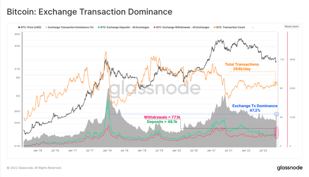 Całkowita liczba potwierdzonych transakcji sieci Bitcoina wzrosła w ciągu ostatnich dwóch tygodni, osiągając wielomiesięczny szczyt 246 tys. potwierdzonych transakcji dziennie. Z tej sumy, około prawie 30% stanowiły transfery związane z wypłatami walutowymi (ponad 77 tys. wypłat), a 18.2% to transfery depozytów walutowych (48.1 tys. depozytów). Gwałtowny wybuch aktywności w sieci związanej z wymianą BTC spowodował, iż dominacja transakcji wpłat i wypłat walutowych wyniosła 47,4%, co jest najwyższym poziomem od roku. Historycznie, wyższa dominacja wymiany Bitcoinów może być związana z rynkami byka (trwałe trendy) i wydarzeniami o wysokiej zmienności (krótkotrwałe skoki zmienności). Źródło: Glassnode