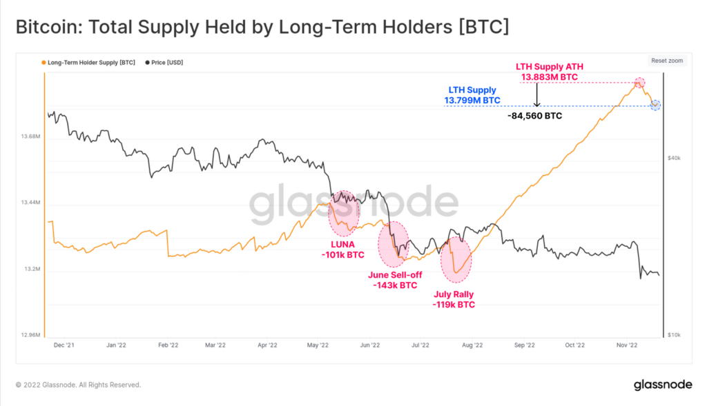 W czasie od upadku FTX, sprzedano łącznie 254 tys. BTC starszych niż 6 miesięcy (należących do adresów długoterminowych inwestorów tzw. long term holders, LTH), co odpowiada około 1,3% krążącej podaży. Biorąc pod uwagę 30-dniowej zmianę stanowi to najbardziej gwałtowny spadek podaży starszych monet od czasu hossy w styczniu 2021 roku, kiedy to długoterminowi inwestorzy realizowali zyski na rynku byka. Widzimy więc, iż kapitulacja 'starych wyjadaczy’ ma miejsce na naszych oczach, choć wciąż jej daleko do tego, co obserwowaliśmy w szczycie poprzedniej hossy ponieważ inwestorzy długoterminowi mają tendencję zwiększać podaż gdy ceny Bitcoina rosną. Źródlo: Glassnode