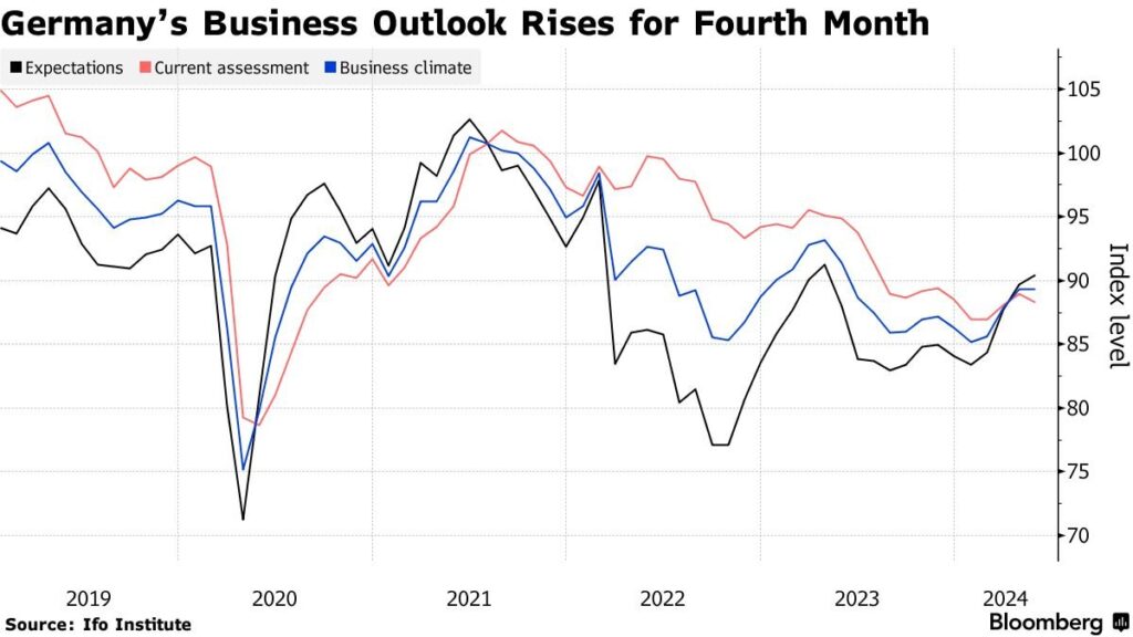Dzisiejszy odczyt sentymentu z Niemiec wskazuje na przebiegające powoli (ale jednak) ożywienie. Odczyt Ifo wskazał 90,4 (ekonomiści oczekiwali 90,8). Perspektywy niemieckiego biznesu wzrosły czwarty miesiąc z rzędu. W kwietniu wyniósł 89,7. Biorąc pod uwagę, iż w drugim roku koszty kredytu ponownie spadną, a EBC obniży stopy – inwestorzy powoli zmieniają się w ostrożnych optymistów. Bazowa prognoza zakłada, iż odbicie gospodarcze kraju wzmocni się w pozostałej części roku. Niemcy uniknęły recesji zimą, częściowo dzięki łagodnej pogodzie, która pobudziła budownictwo i pomogła podnieść PKB o 0,2% w I kw.