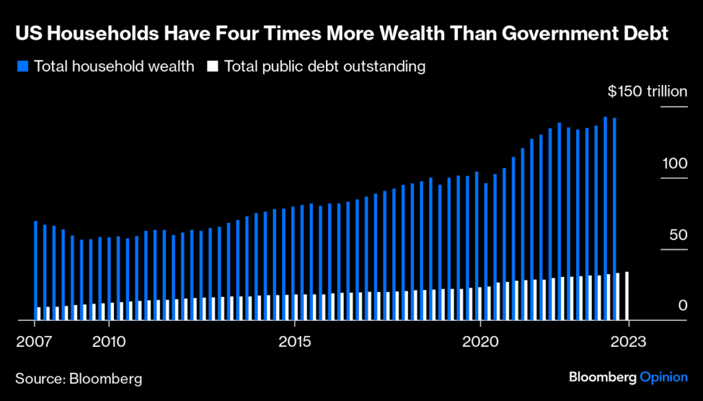 Amerykanie pozostają majętni, co chroni jak dotąd kraj przed większym kryzysem choć warto podkreślić na spore nierówności majątkowe. Gospodarstwa domowe posiadają 4-krotnie więcej środków, niż wart jest dług USA. Źródło: Bloomberg