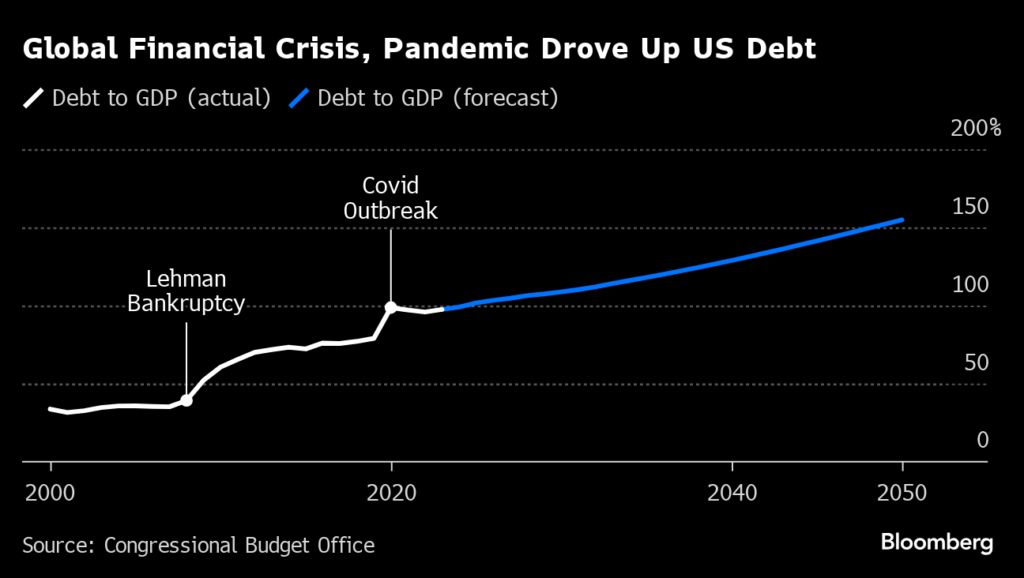 GFC w 2008 a następnie pandemia koronawirusa napędzały kryzys zadłużenia w USA. Źródło: Bloomberg, CBOGdzie ten krach?