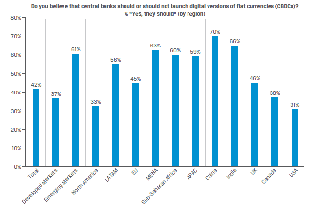 W przypadku Indii i Chin zwolenników cyber-walut centralnych ma być odpowiednio 66 i 70% (choć biorąc pod uwagę ciężkie brzemię „polityki” państwa, zwłaszcza w tym drugim przypadku respondenci mogą mieć niewielki wybór – tj. profesjonaliści finansowi krytykujący politykę Partii w zakresie CBDC mogliby bardzo gwałtownie przestać być profesjonalistami).