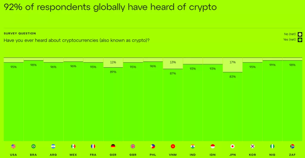 Wyniki badania pokazują, iż rozwijające się regiony świata wykazują największą świadomość i zainteresowanie kryptowalutami. Nigeria, RPA i Brazylia prowadzą w tej kwestii. Z 99% respondentów z Nigerii, którzy wykazali świadomość krypto i ponad 70% prawidłowo definiujących, co to jest blockchain.