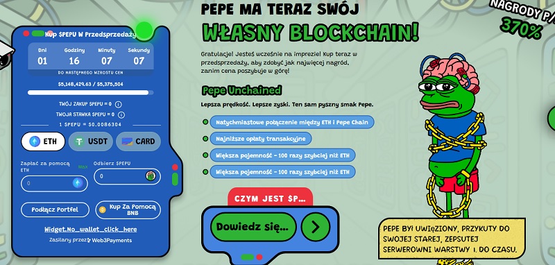 Fot. materiał partneraProjekt Pepe Unchained wciąż jest w fazie przedsprzedaży, dlatego cena tokenów $PEPU jest niska. Na obecnym etapie fazy przedsprzedaży za jeden token $PEPU zapłacić trzeba 0,0086304 USD. W tym celu wystarczy podłączyć portfel kryptowalutowy i nabyć tokeny. Zakupu można dokonać poprzez kryptowaluty Ethereum (ETH), Tether (USDT) lub Binance Coin (BNB). Istnieje też możliwość zapłaty kartą.